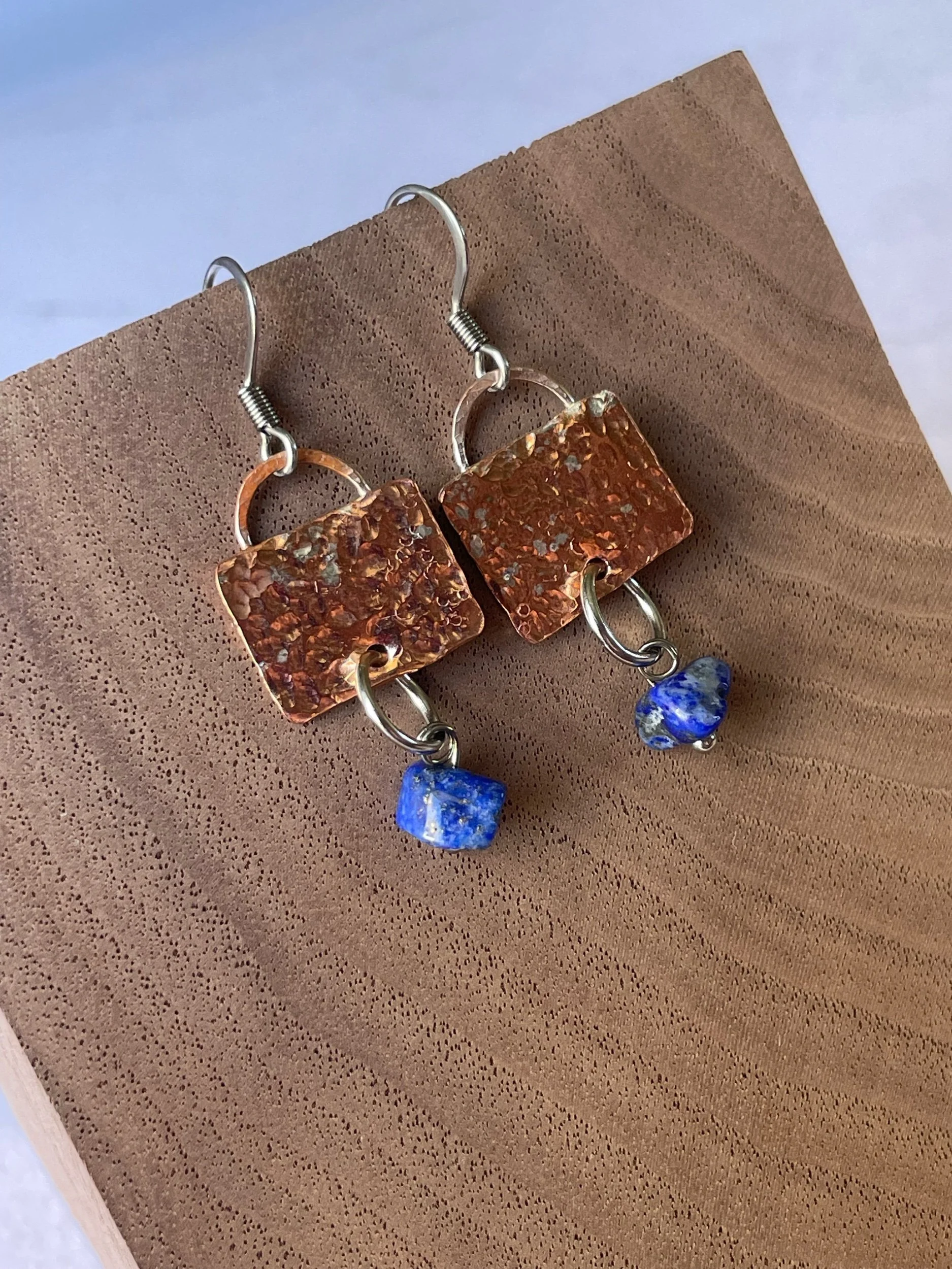 EARRINGS › Image 1 of 5 Image 2 of 5 Image 3 of 5 Image 4 of 5 Image 5 of 5 $55.00 Dainty copper dangles with silver solder details, lapis, and hypoallergenic stainless steel ear wires. Add To Cart Added! Dainty copper dangles with silver solder details, lapis, and hypoallergenic stainless steel ear wires.