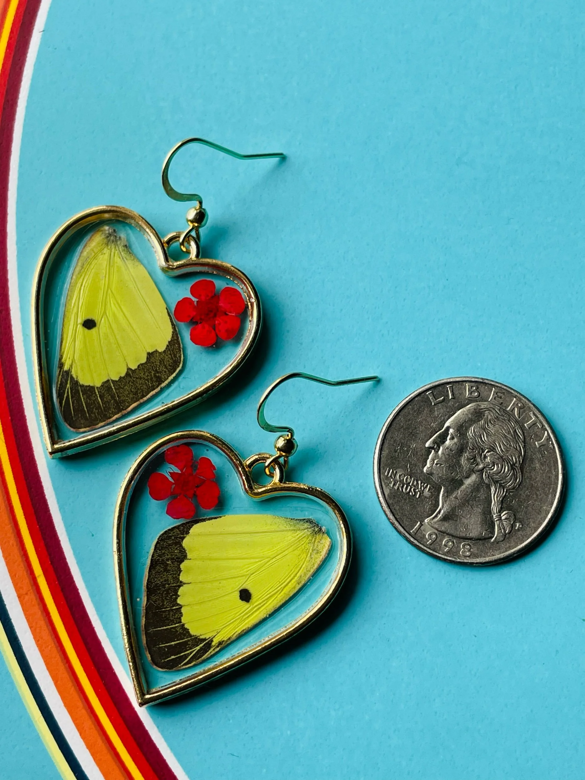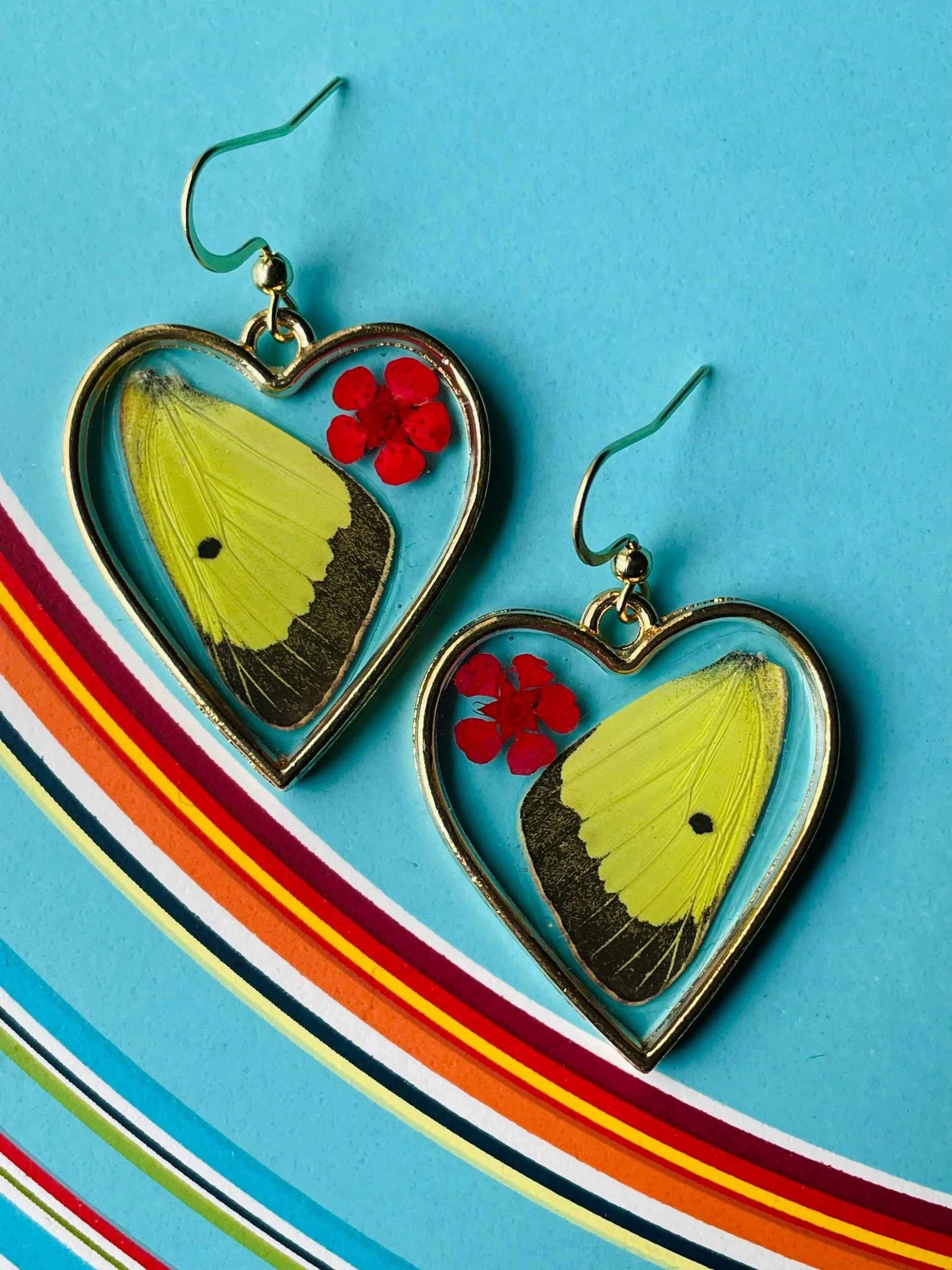 EARRINGS › Image 1 of 2 Image 2 of 2 $40.00 Gold plated micro collage butterfly wing earrings with pressed flowers. Add To Cart Added! Gold plated micro collage butterfly wing earrings with pressed flowers.