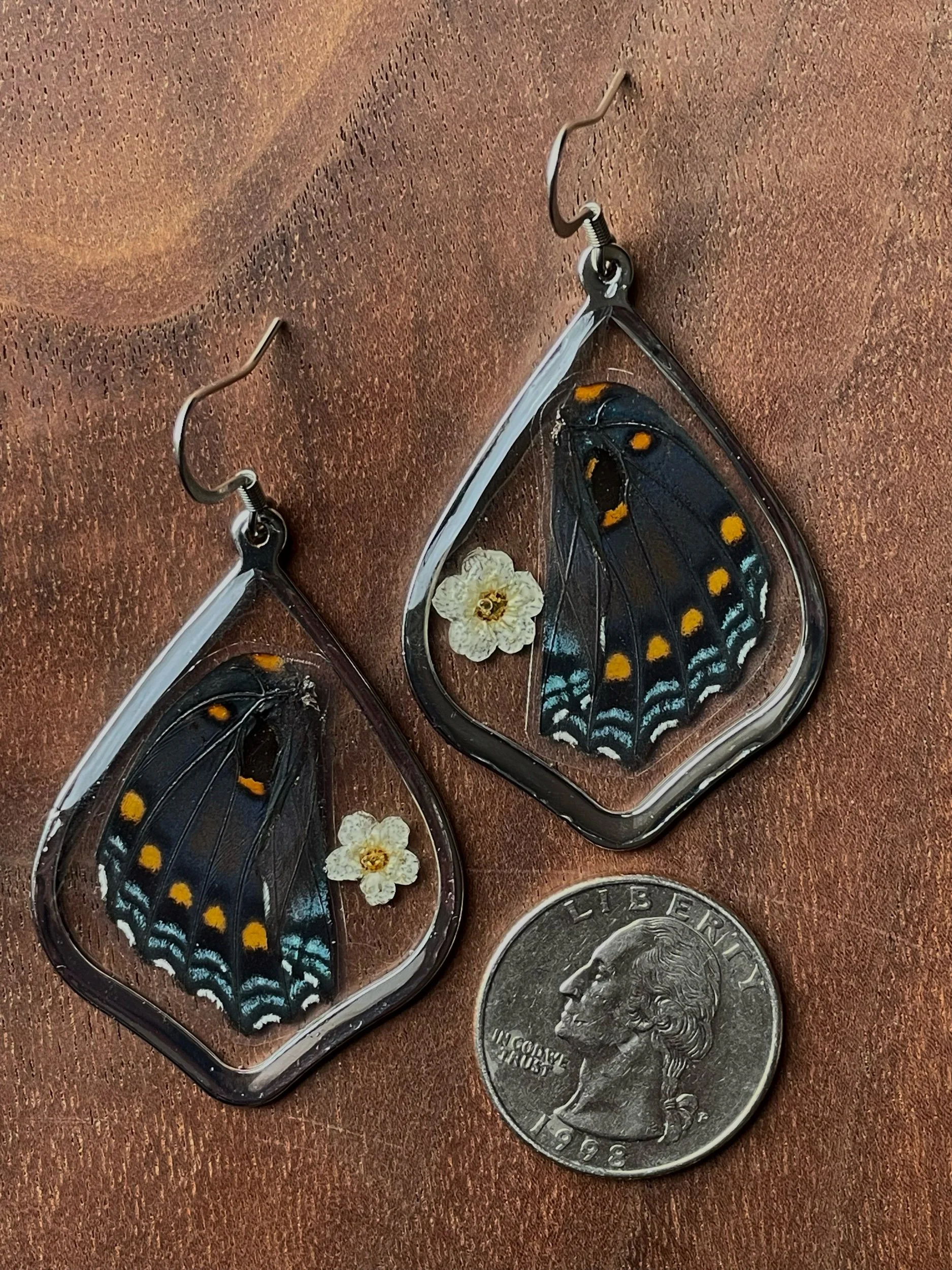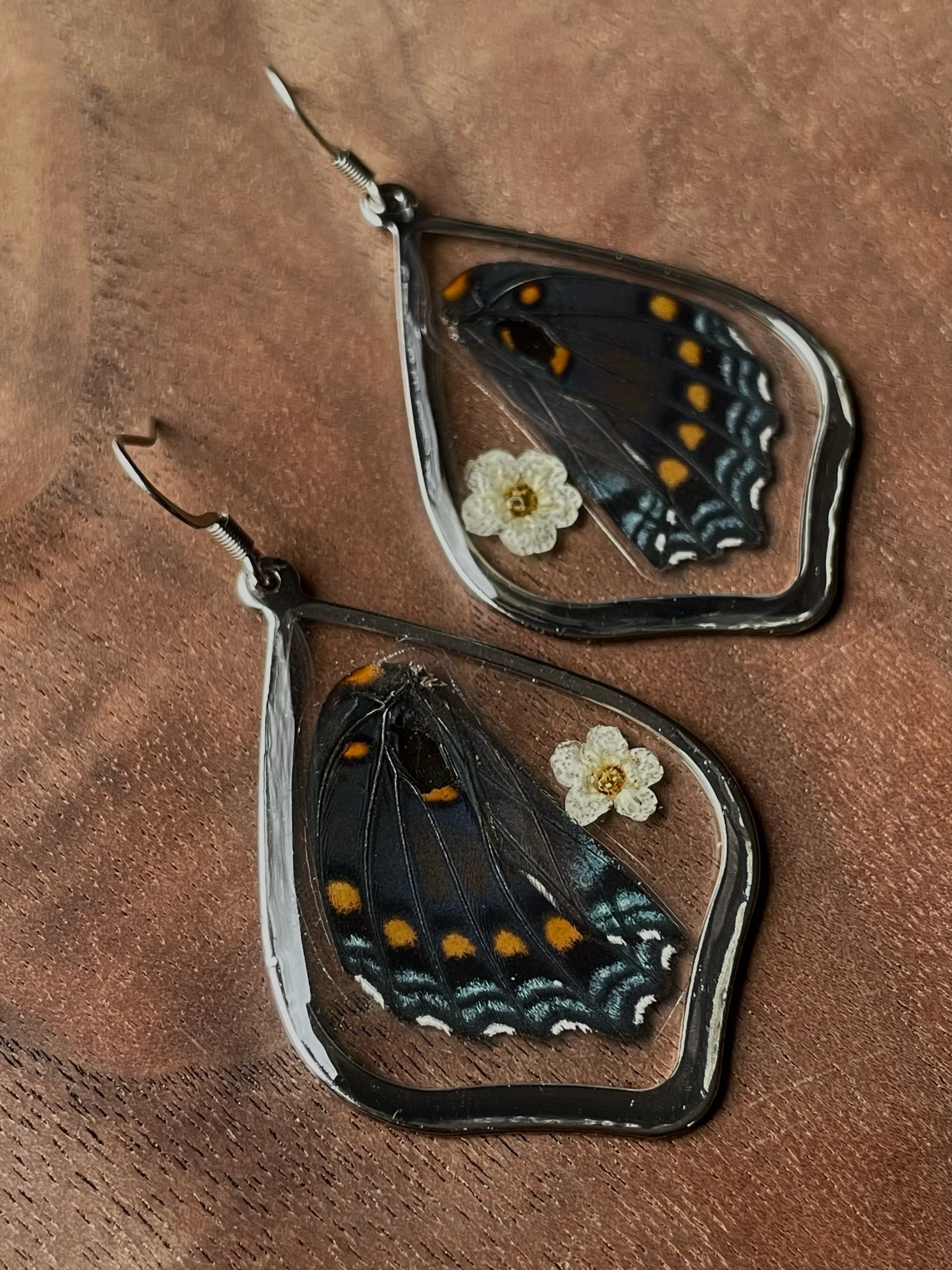 EARRINGS › Image 1 of 2 Image 2 of 2 $45.00 Silver plated micro collage butterfly wing earrings with pressed flowers. Ear wires are hypoallergenic stainless steel. Add To Cart Added! Silver plated micro collage butterfly wing earrings with pressed flowers. Ear wires are hypoallergenic stainless steel.