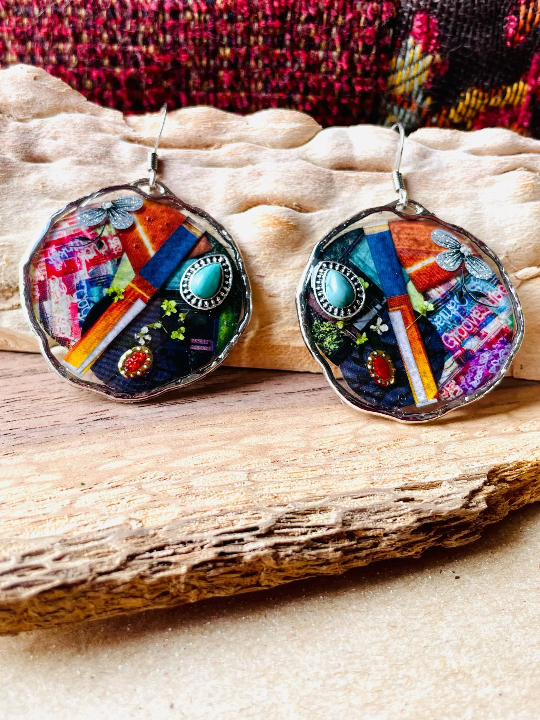 Silver plated mixed media earrings with magazine clippings, pressed flowers, and synthetic turquoise. Ear wires are hypoallergenic stainless steel.
