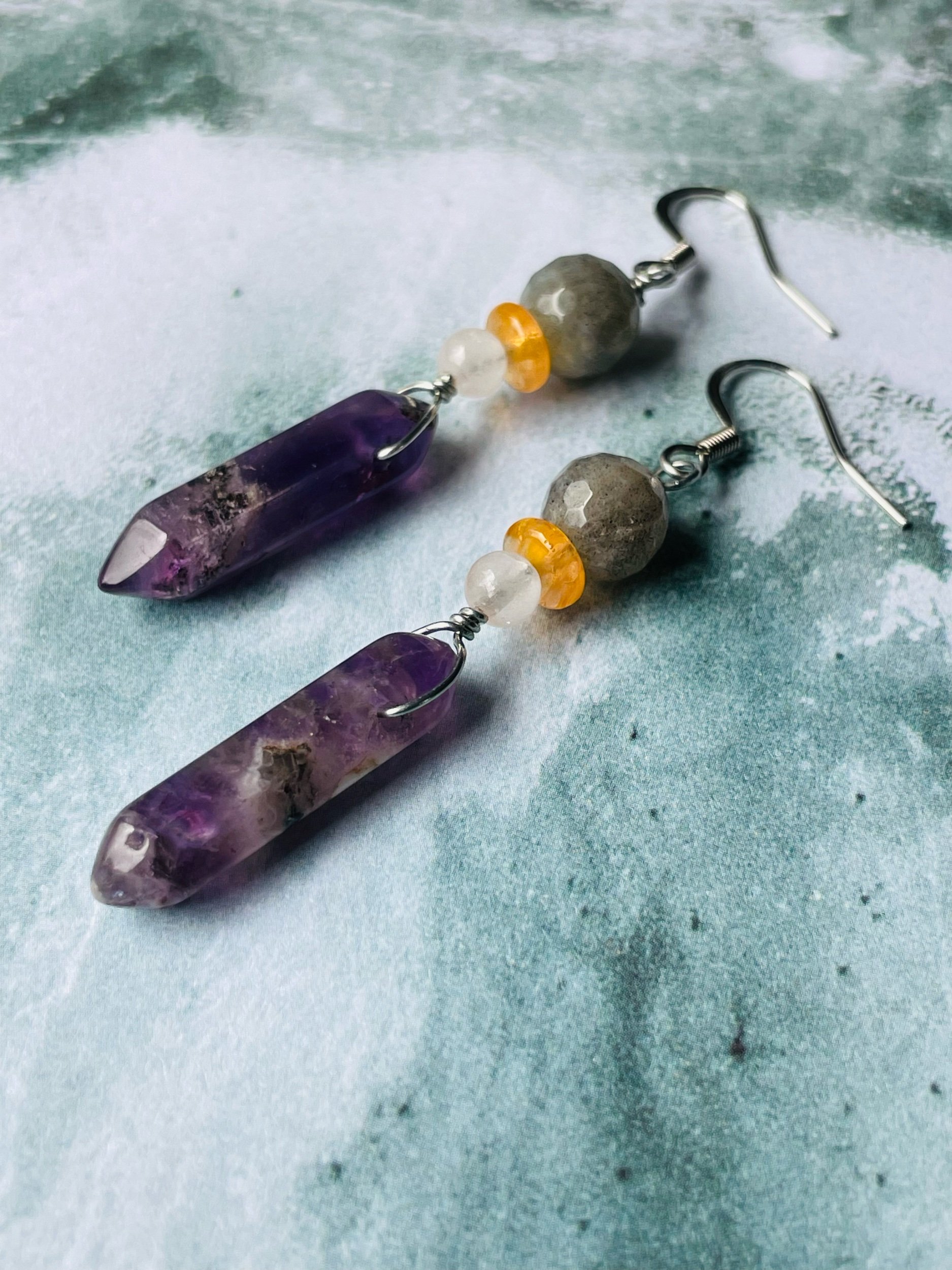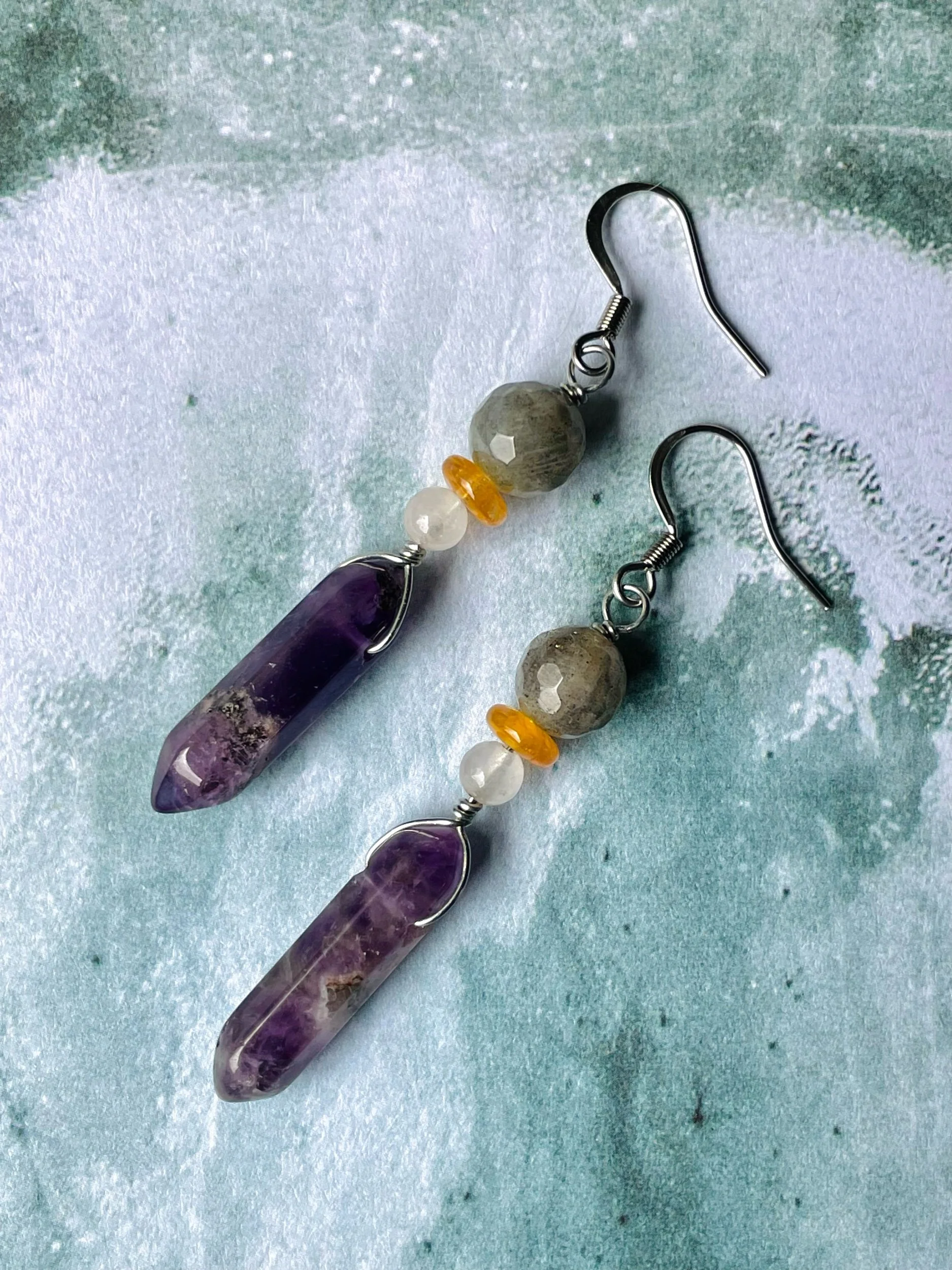 EARRINGS › Image 1 of 3 Image 2 of 3 Image 3 of 3 $45.00 Hypoallergenic steel wire wrapped dangles with amethyst points, labradorite, Czech glass, and rose quartz. Add To Cart Added! Hypoallergenic steel wire wrapped dangles with amethyst points, labradorite, Czech glass, and rose quartz.