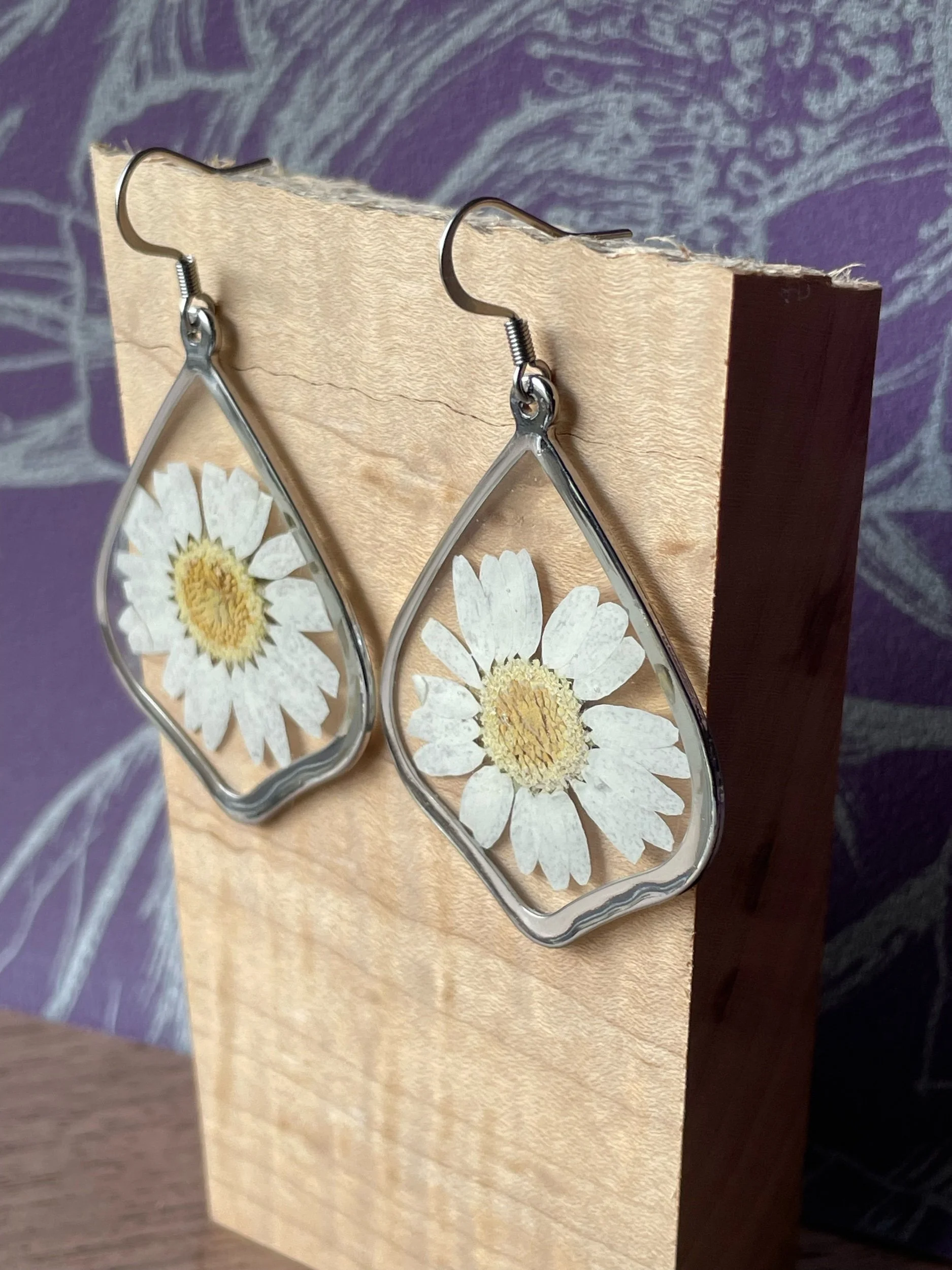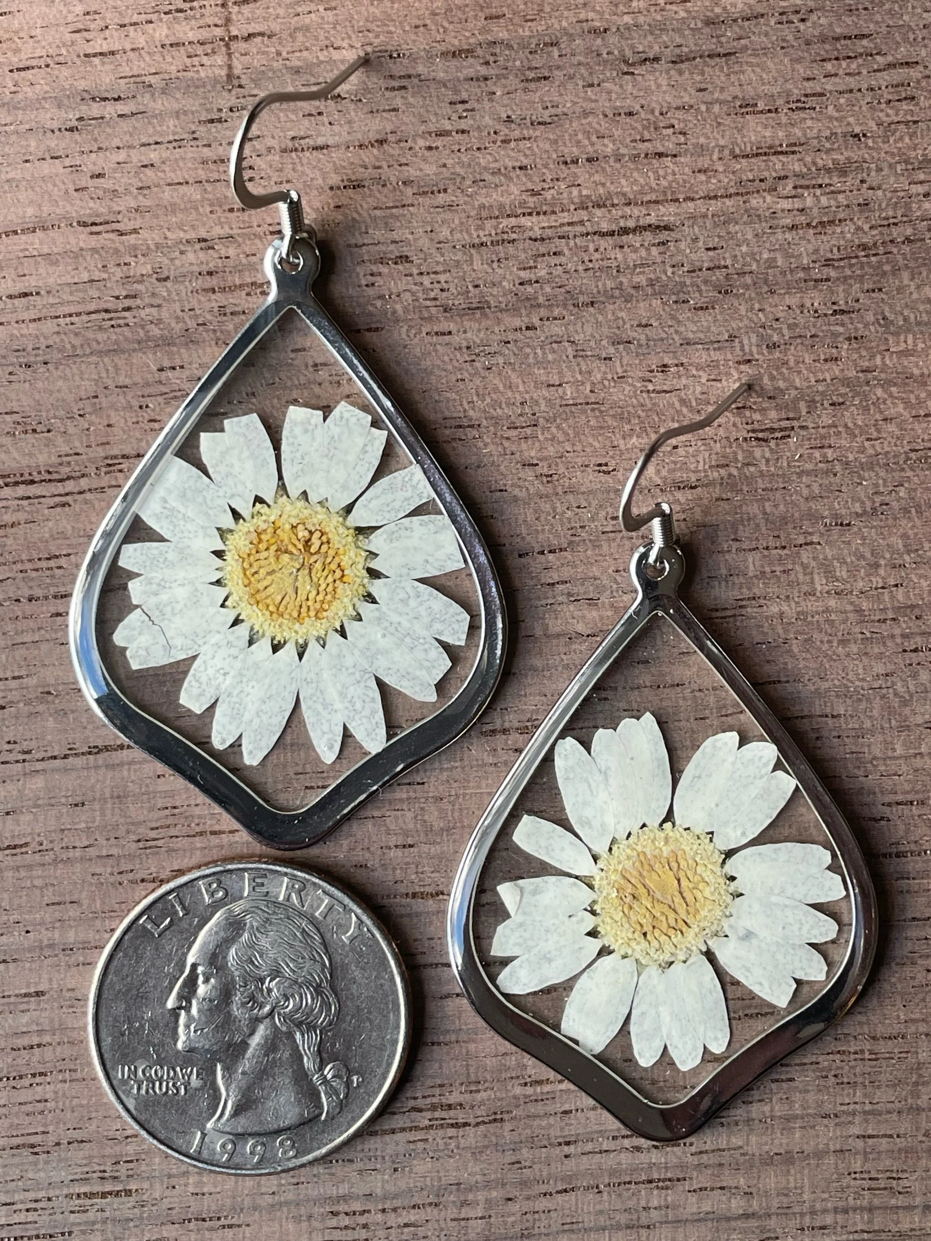 EARRINGS › Image 1 of 2 Image 2 of 2 $35.00 Silver plated daisy earrings with stainless steel ear wires. Add To Cart Added! Silver plated daisy earrings with stainless steel ear wires.