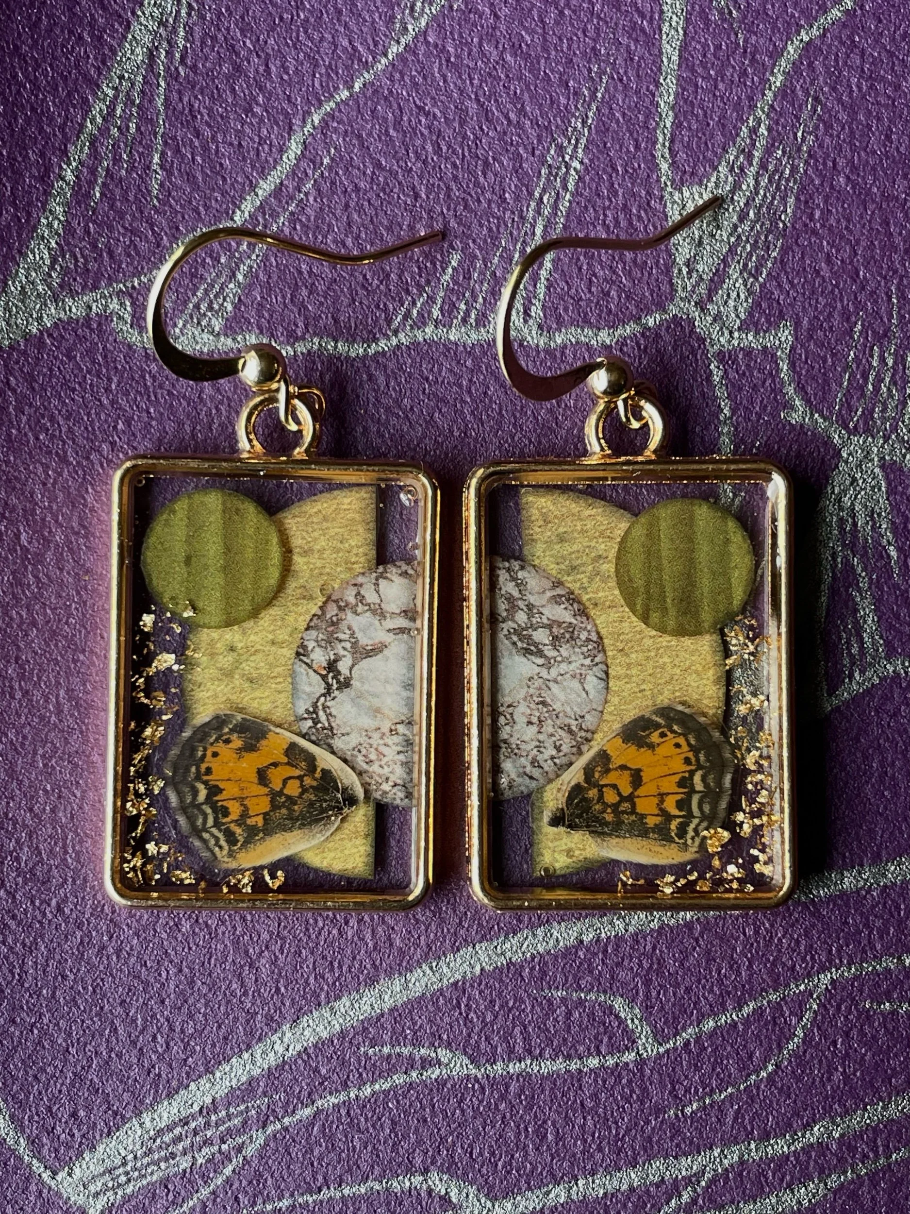 EARRINGS › Image 1 of 2 Image 2 of 2 $40.00 Gold plated micro collage butterfly wing earrings with magazine clippings, and gold flake. Add To Cart Added! Gold plated micro collage butterfly wing earrings with magazine clippings, and gold flake.