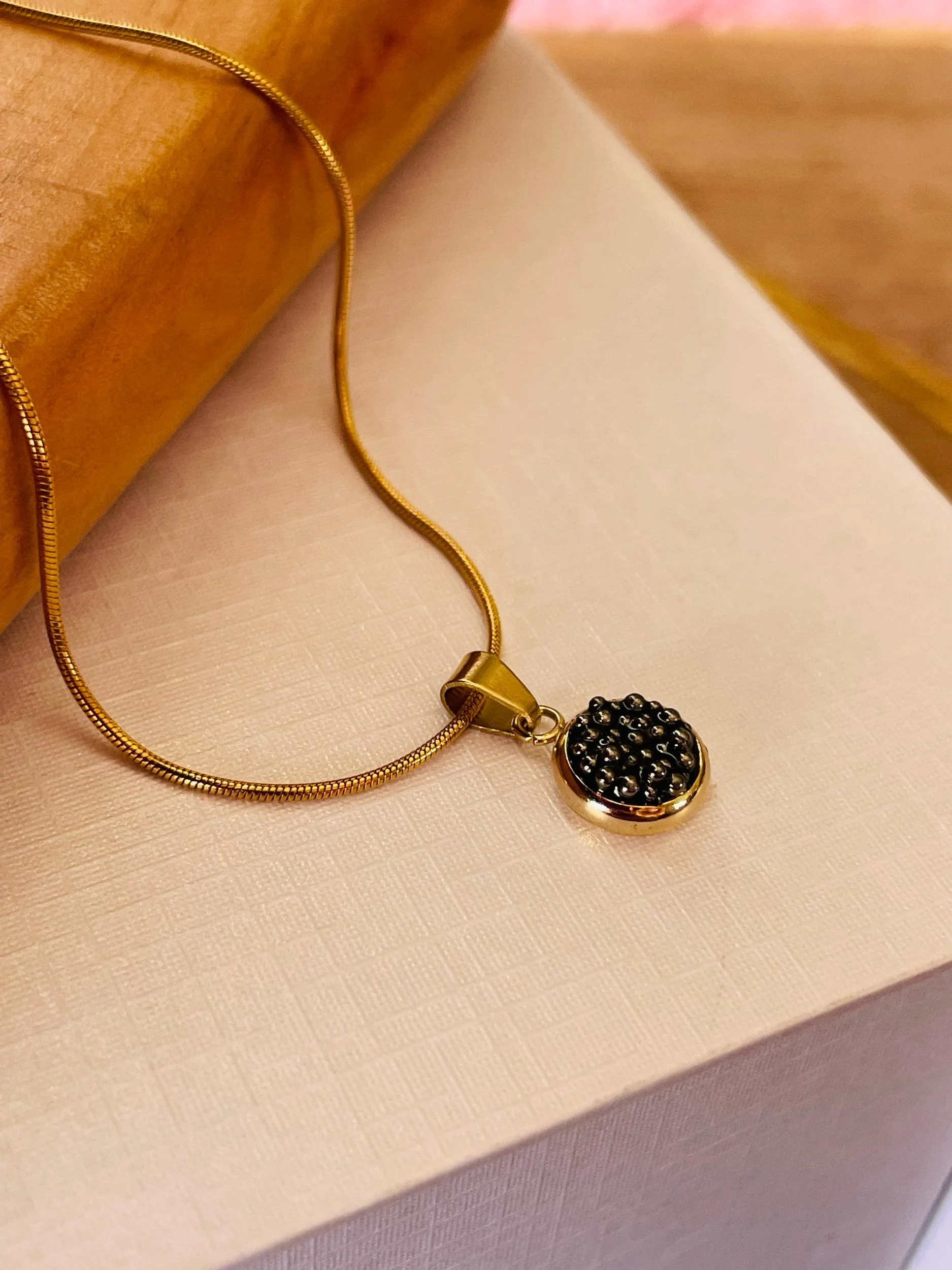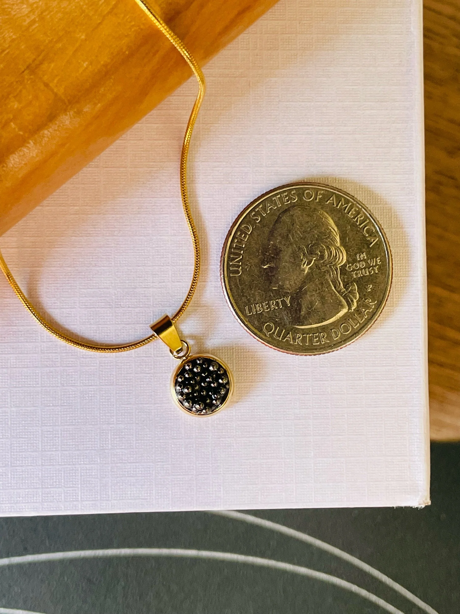 Caviar inspired gold/silver plated mixed media pendant with micro mini metallic balls. Necklace is hypoallergenic stainless steel with a length of 16” + 2” extender for versatile wear.
