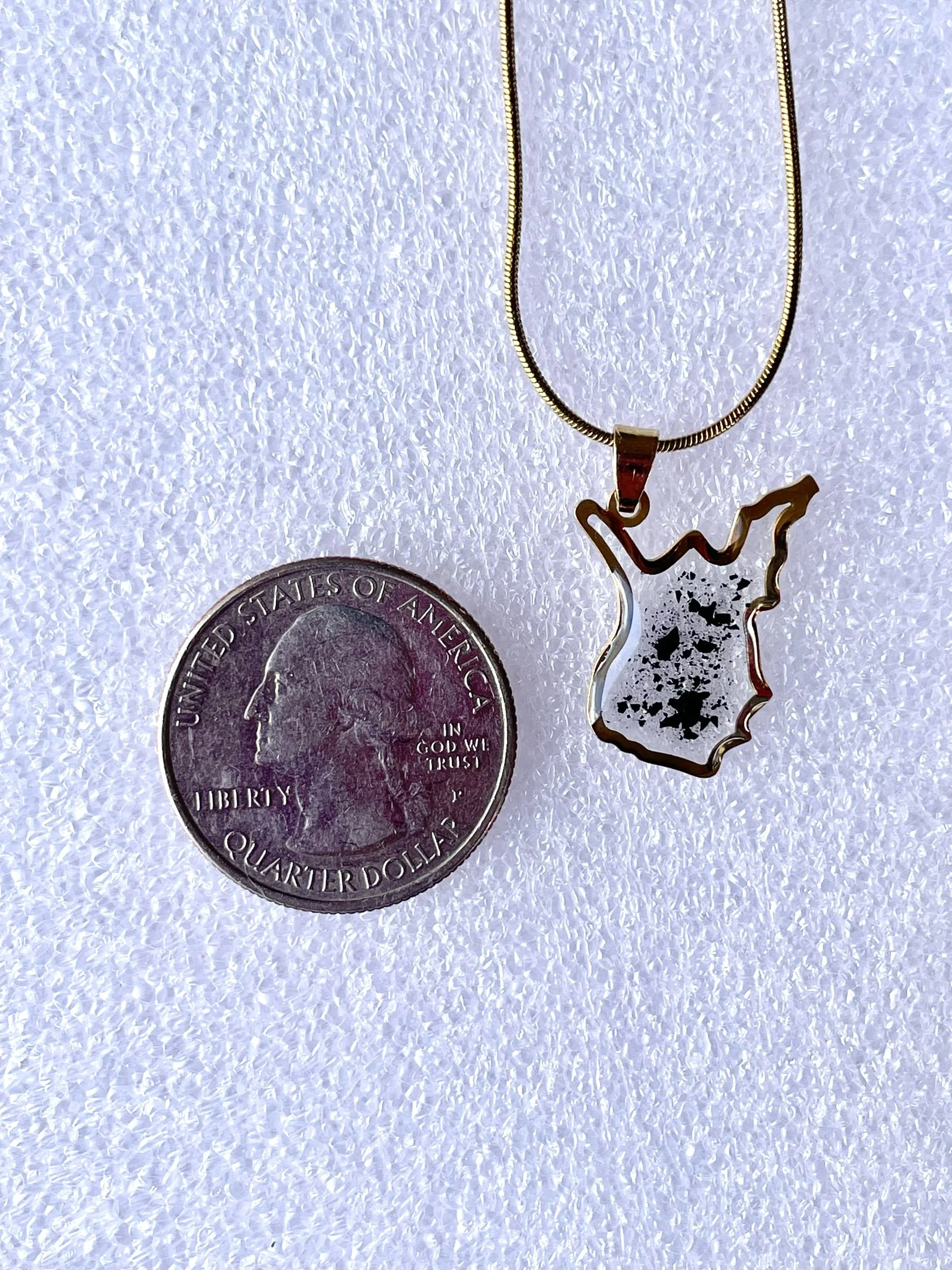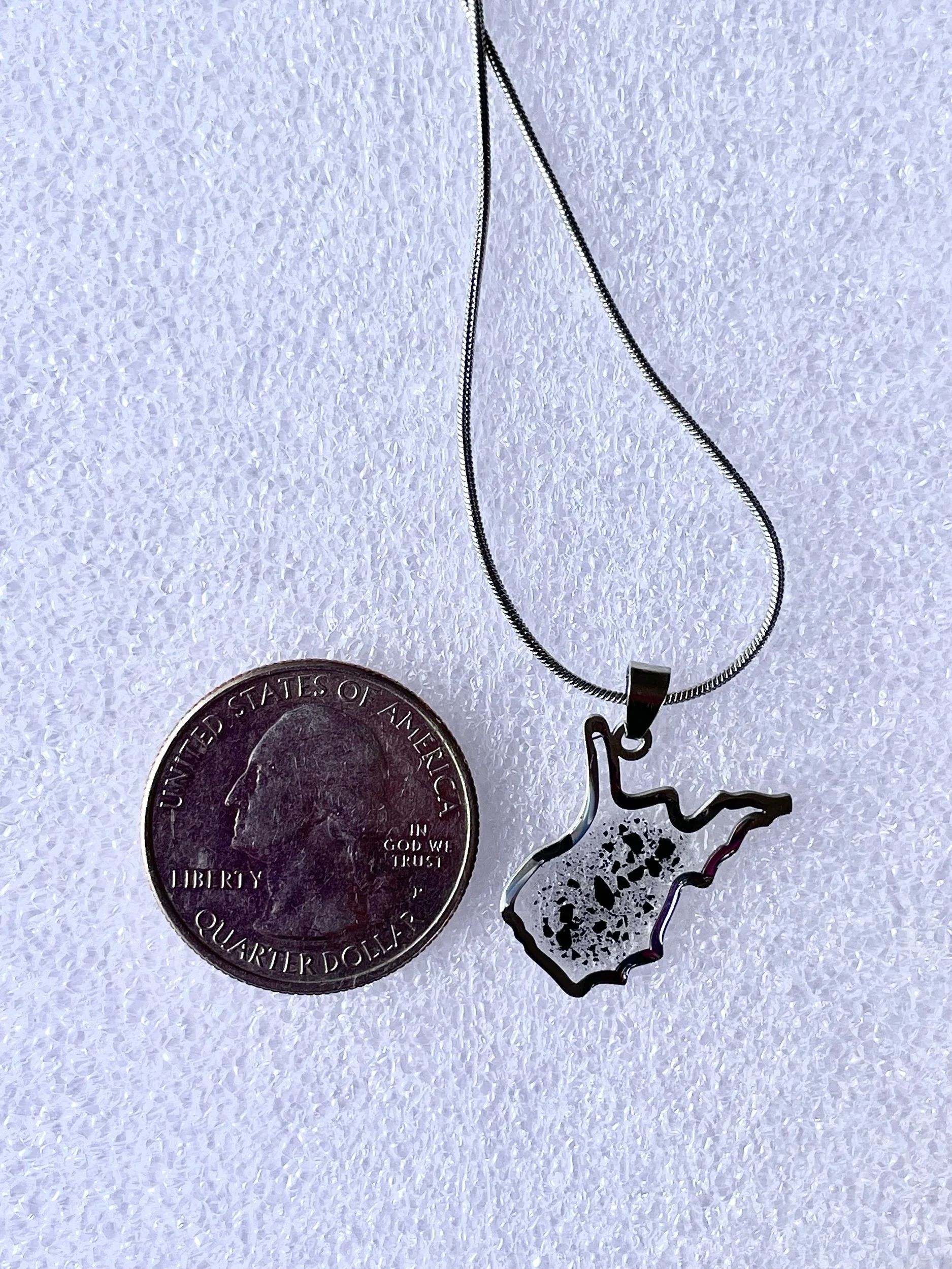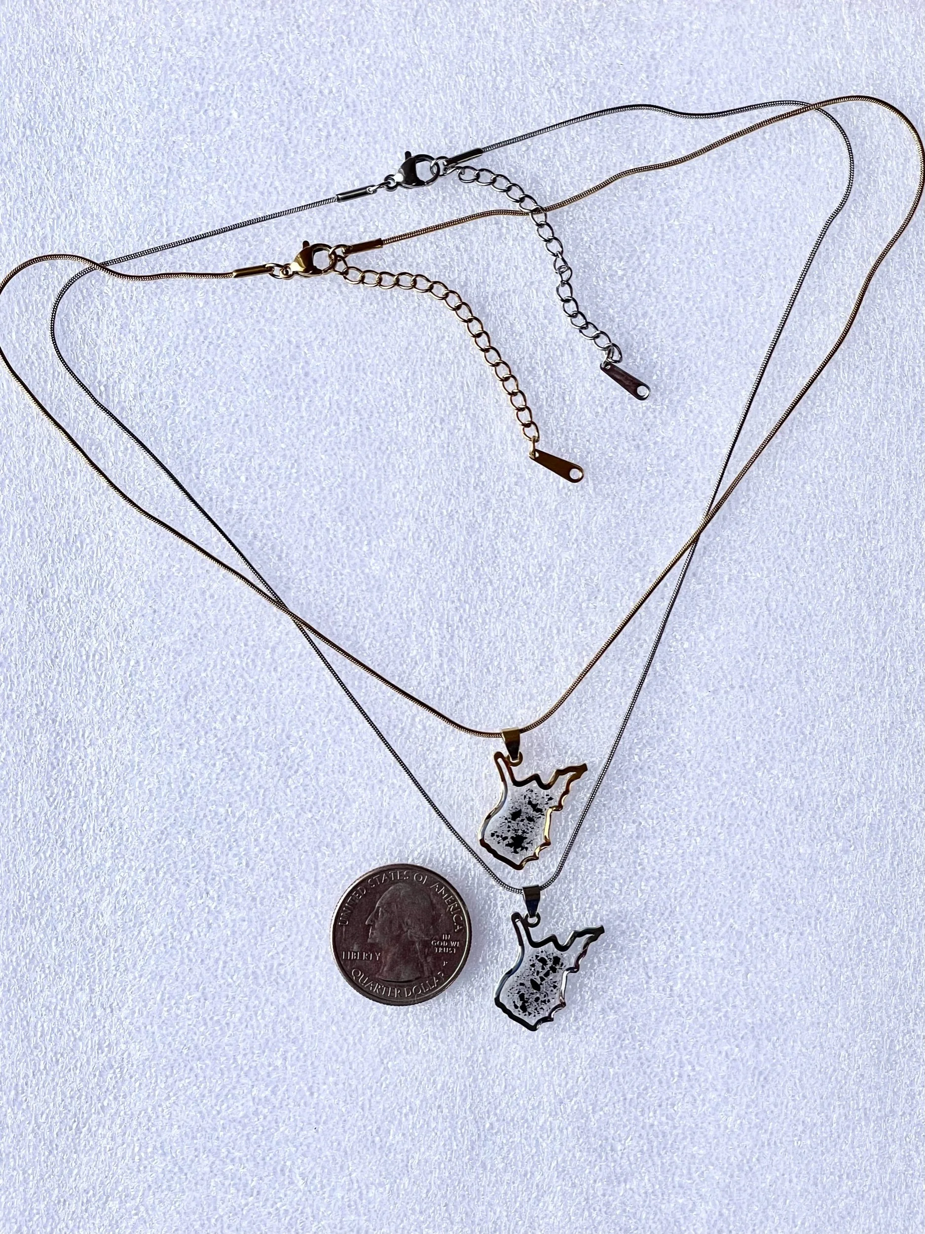 Made to order stainless steel or gold plated necklace with authentic West Virginia coal dust preserved in eco-resin - 16” snake chain with 2” extender included with purchase. Customization with additional elements available upon request (i.e. pressed flowers, gold flake, collage elements etc). Email micksmediajewelry@gmail.com or send a direct message on social media for more information about how to customize your order.