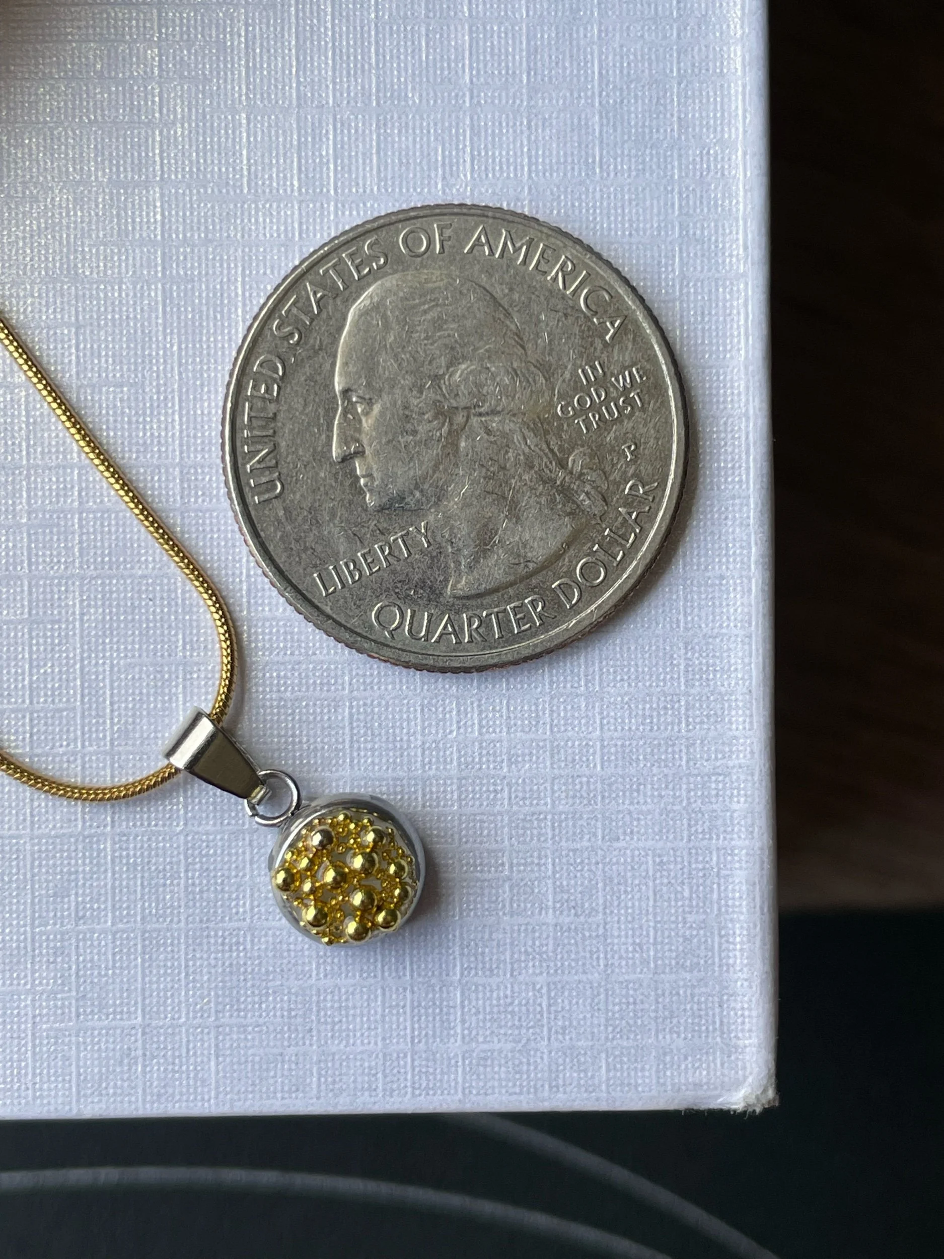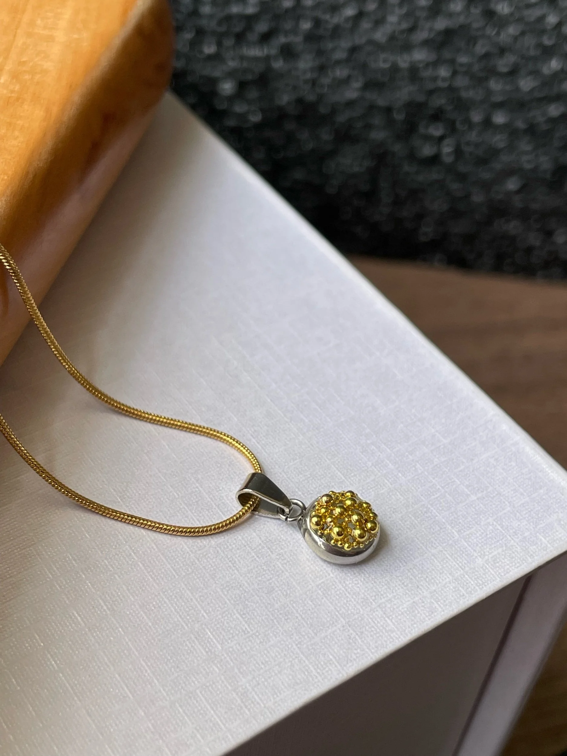 Caviar inspired stainless steel and gold plated mixed media pendant with micro mini metallic balls. Necklace is gold plated hypoallergenic stainless steel with a length of 16” + 2” extender for versatile wear (please direct message me to swap chain for stainless steel or different length).